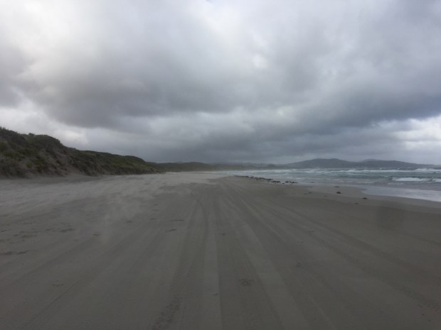 The trail here has a 7 km beach walk on Mazoletti Beach followed by a 2 km hill climb to the campsite. The beach was a stunning elongated crescent and gave incredible views back to Parry Beach and also across the bay itself. The southern ocean was wild and it was no surprise that it is often closed in poor weather as it becomes very narrow at the far end of the beach. The rain returned and our legs were whipped by the blowing sand. We passed several 4WDrs who looked at us with a theory that we must be crazy to be out here hiking in the rain before sunset.