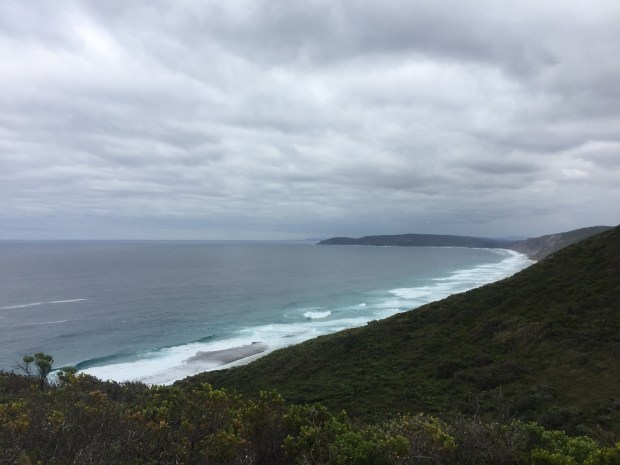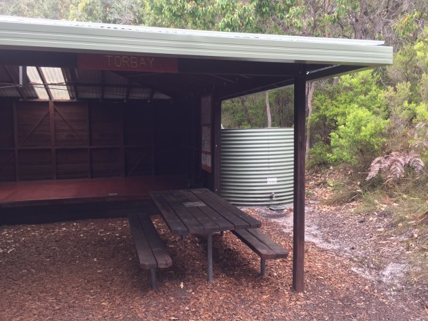 We left Greg behind and continued on down a gradual descent to a local tourist spot called Cosy Corner. From there, it was a 7 km beach walk past Torbay Inlet only marginally shorter than the walk along Mazoletti Beach of a few days ago. The inlet normally requires wading across but at this time of year is bridged by a sandbar so we could keep our feet dry. From the end of the beach, it was a short 3 km walk to our final campsite of the trail at Mutton Bird.