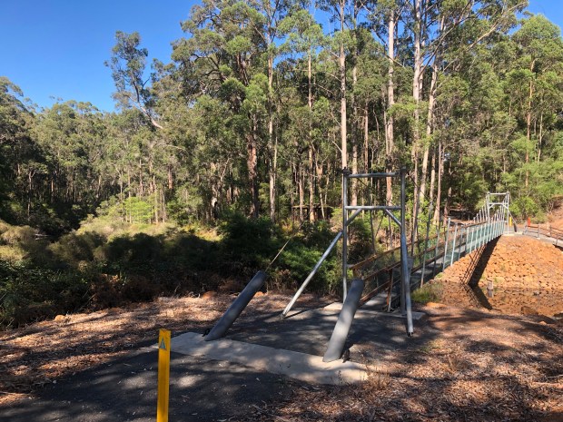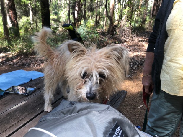 An older lady came up to talk to us shortly after we sat down. She explained her daughter and friend were cycling the Munda Biddi which is a mountain bike track which often parallels the Bibb between Kalamunda and Albany. She was acting as support crew. She had with her three dogs and, as an animal lover, I couldn’t resist stroking them. Her daughter turned up shortly thereafter and also came up for a chat. Very nice and friendly people.