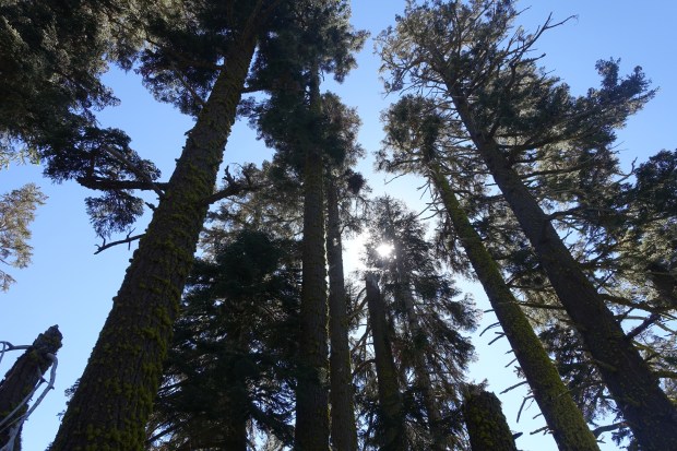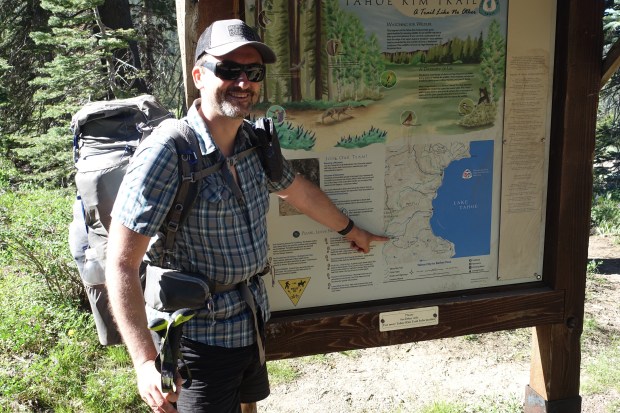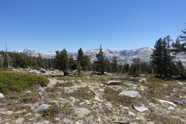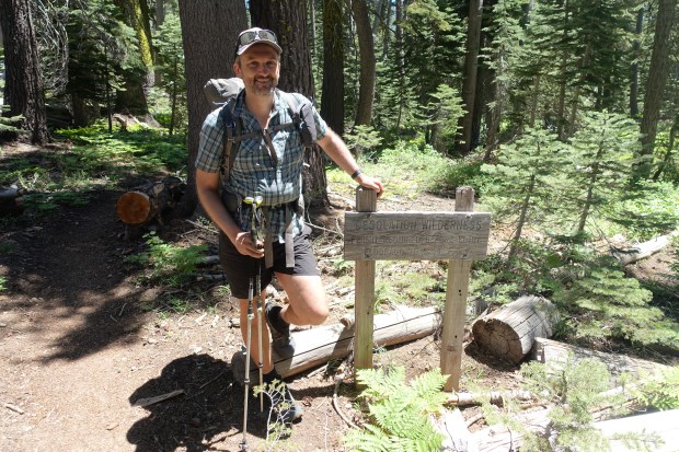 Shortly after lunch, we passed the sign for Desolation Wilderness. This is a pristine part of the trail for which permits are required. We got glimpses of the mountains on the right hand side but the trail continued through the pine forest.