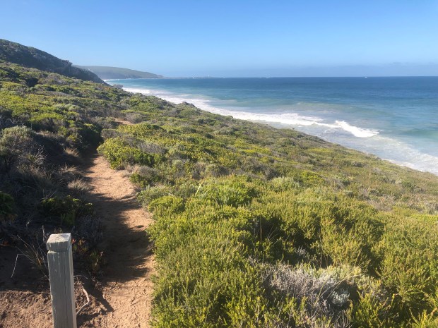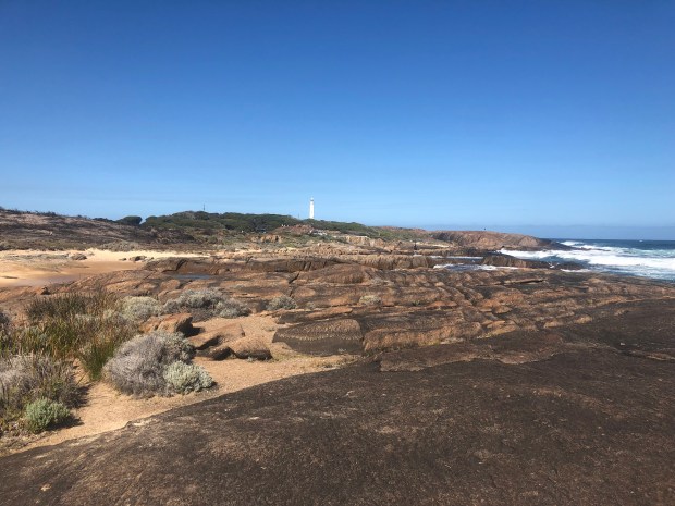 The trail then exited the beach and followed some sand dunes before heading inland and following the line of coast through the coastal scrub. Every so often we would catch a glimpse of the lighthouse which was getting ever closer.