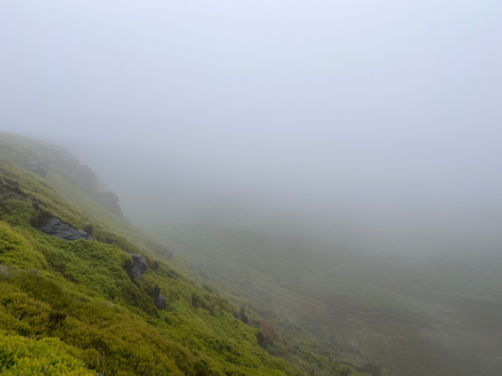 The rain grew stronger as we gained in elevation and we were soon hiking in clouds slipping and sliding along the path. The rain would occasionally ease off allowing for a few photos but generally it was more or less constant. The slope eventually eased off and we began a long but easy climb up to Black Hill.