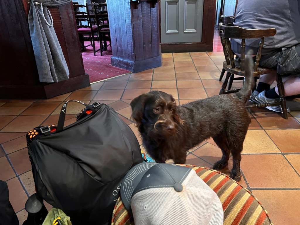 Eventually we reached Marsden and our accommodation for the evening. Once I got to the room, it was time for a pack explosion with every spare spot dedicated to drying wet gear. This done, it was time to head downstairs for a beer and celebrate a successful day. We had a few drinks and the largest burger I’ve ever seen, all the while kept company by Poppy, the friendly dog of the owner.