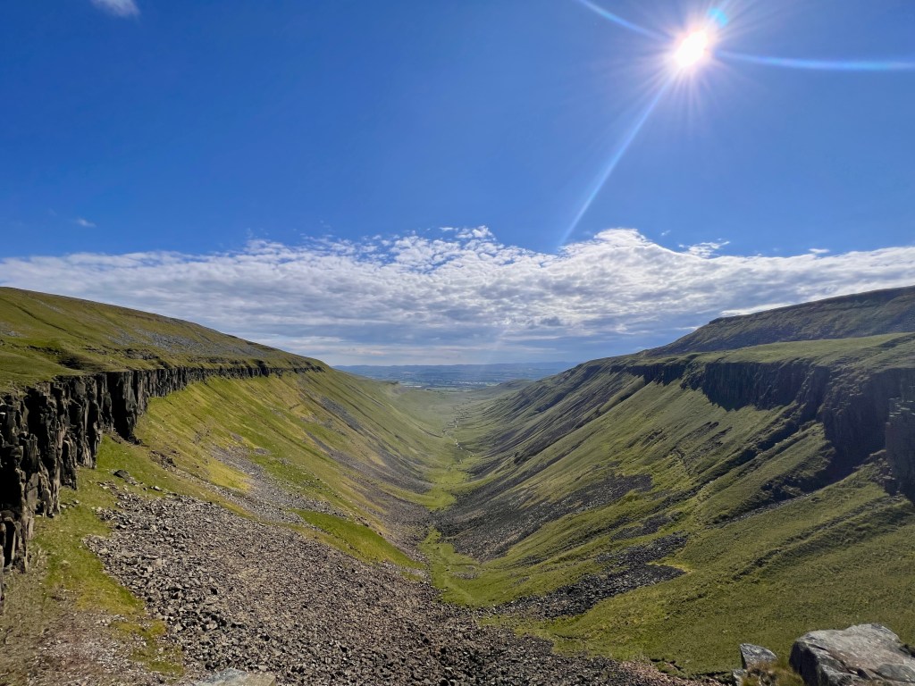The view then opened up spectacularly to show us the full view High Cup Nick. This is a stunning symmetrical U-shaped valley of sheer whinstone cliffs and dolerite crags which was glacially formed in the last ice age. It is a 700 ft drop to the valley floor below.