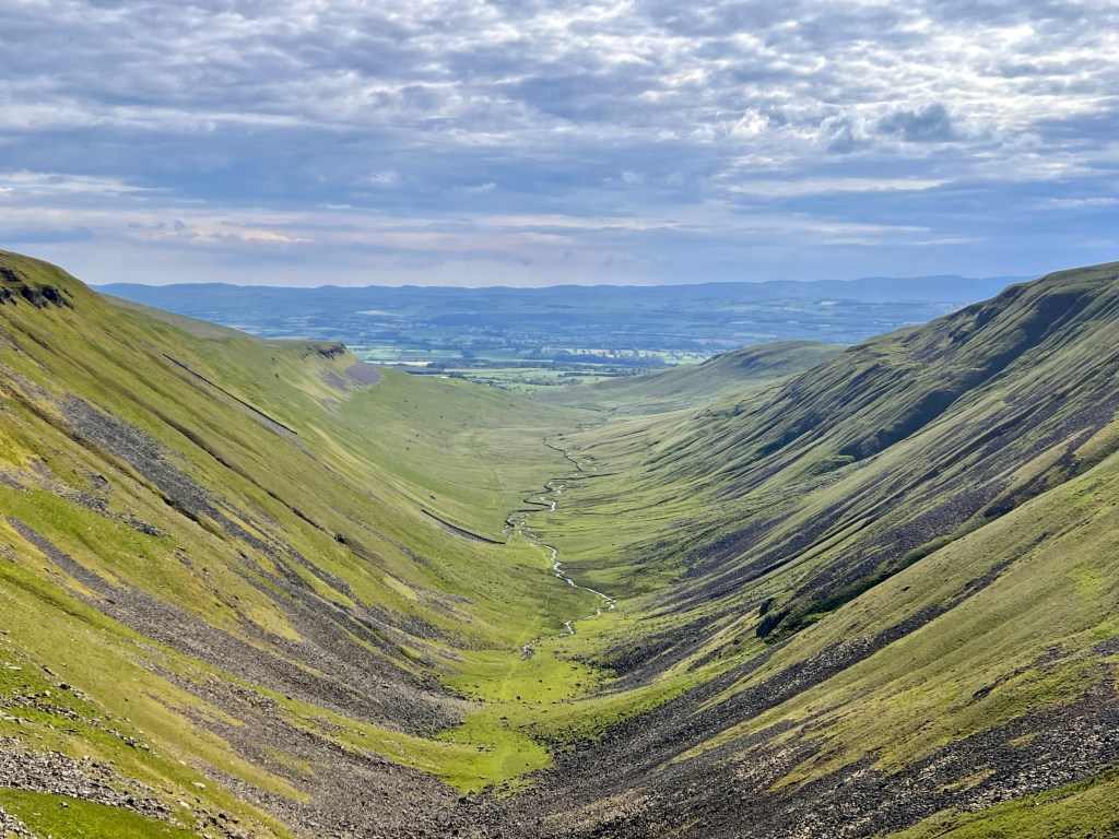 From High Cup Nick, we began a long and steep descent down to the village of Dufton. The views of the Vale of Eden and its rolling fields opened up and we could see further into the Lake District fells. In the distance, we could just see Blencathra and, behind it, Skiddaw which is the sixth highest in England.